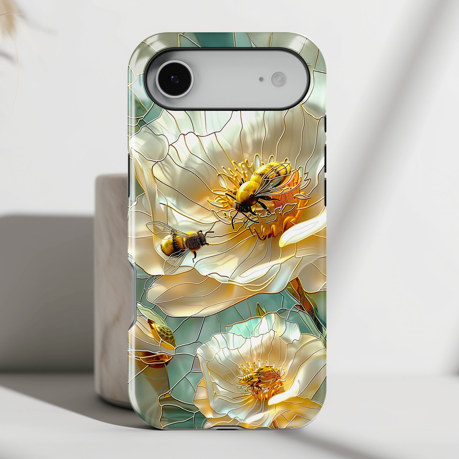 Premium quality protective phone case for iPhone in Bees on Flower Stained Glass design.