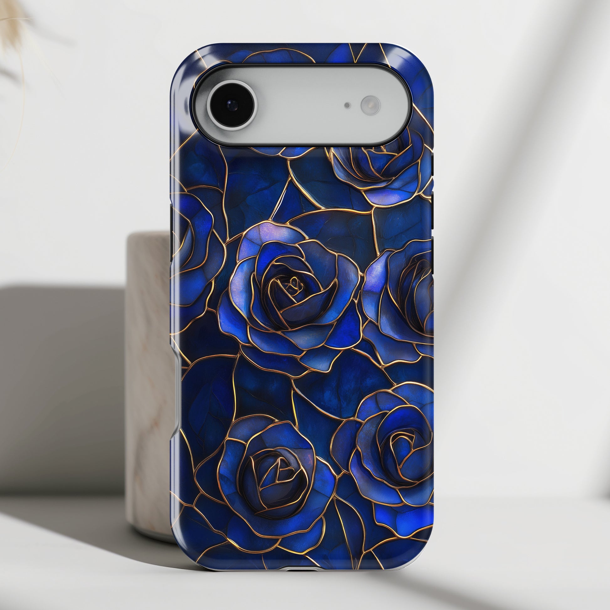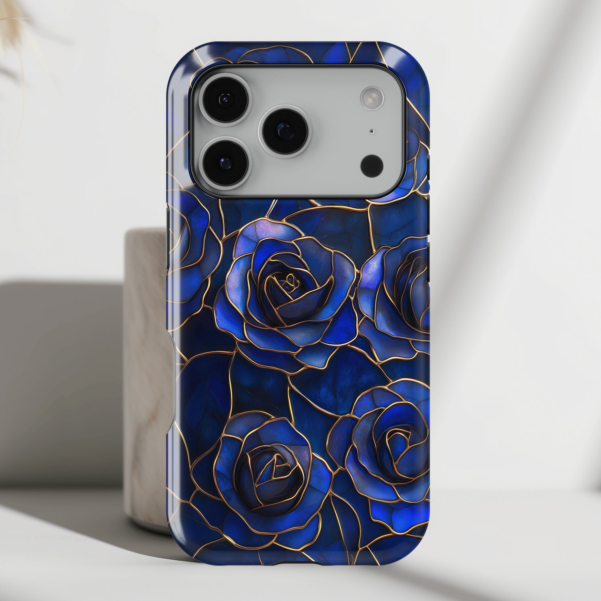 Premium quality protective phone case for iPhone with Blue Roses Pattern Stained Glass design.