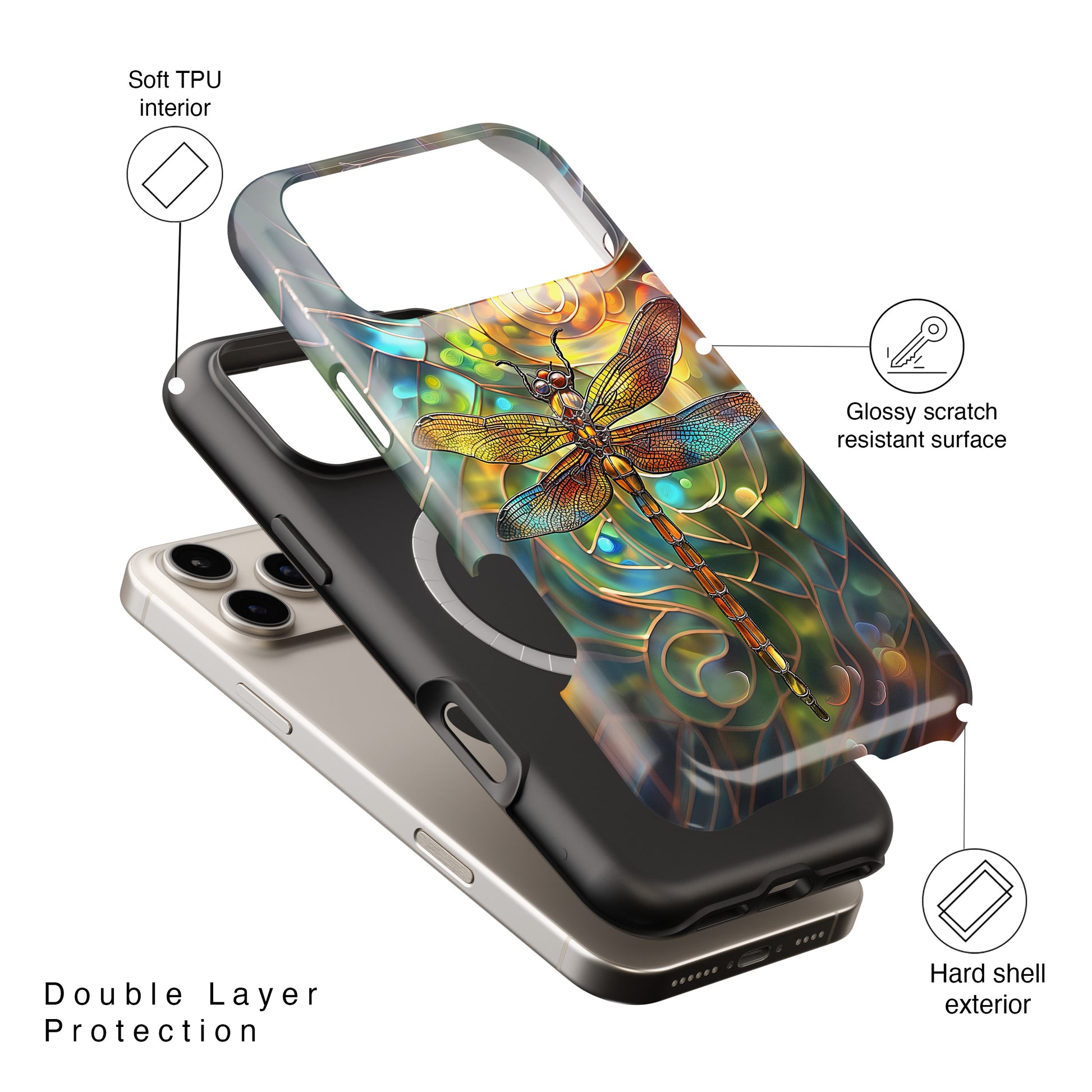 Premium quality protective phone case for iPhone with Dragonfly Stained Glass Mosaic design.