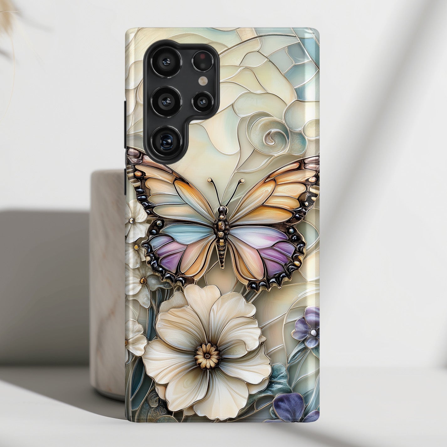 Premium quality protective phone case for Samsung Galaxy S series with Elegant Butterfly & Flowers Stained Glass Design.