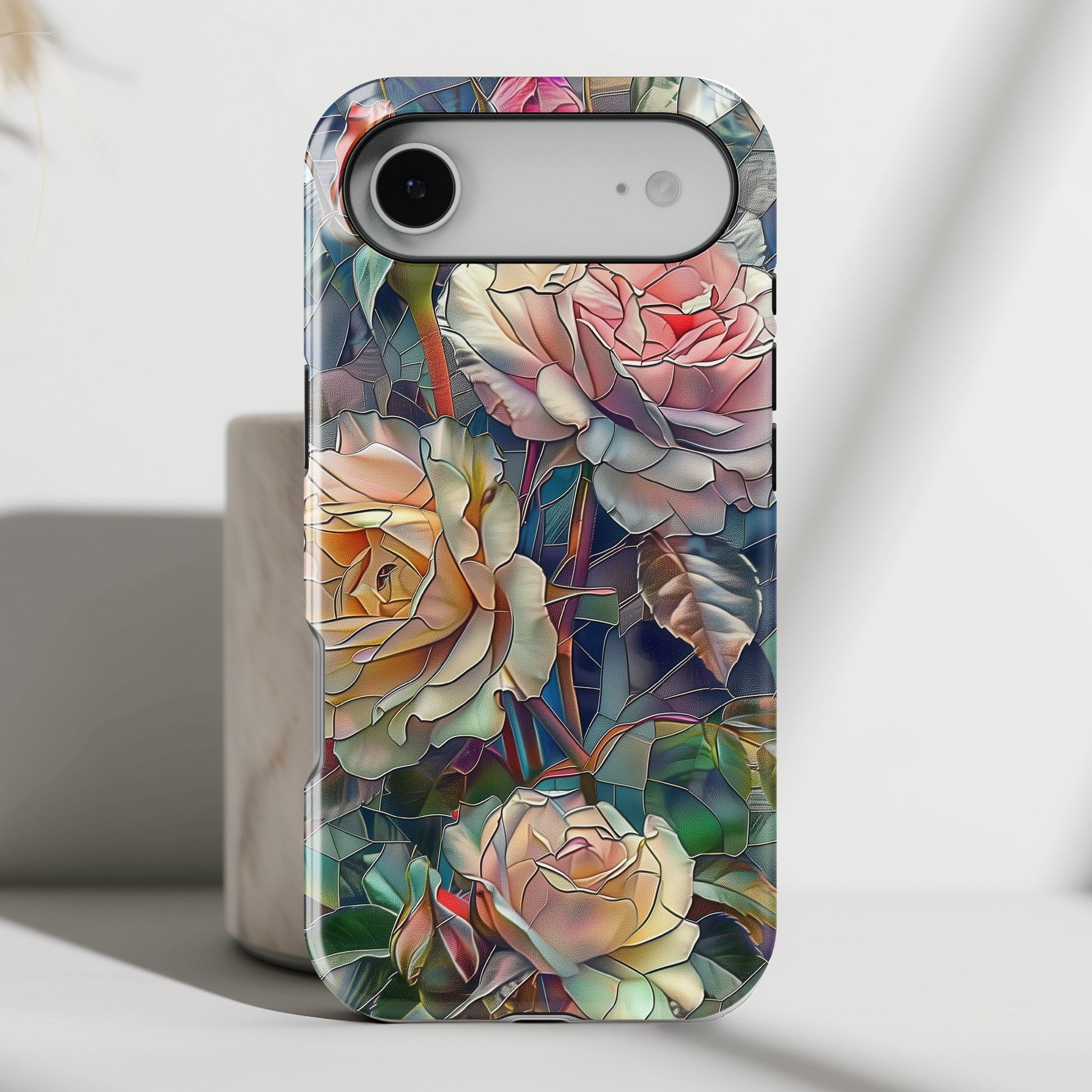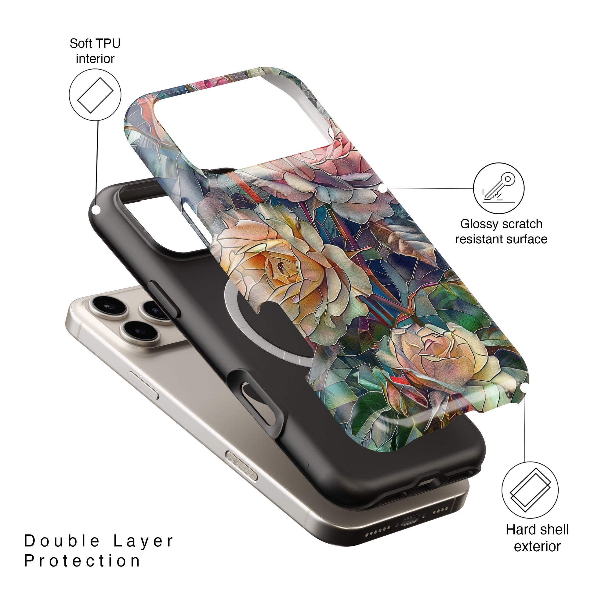 Premium quality protective phone case for iPhone in Elegant Roses Stained Glass design.