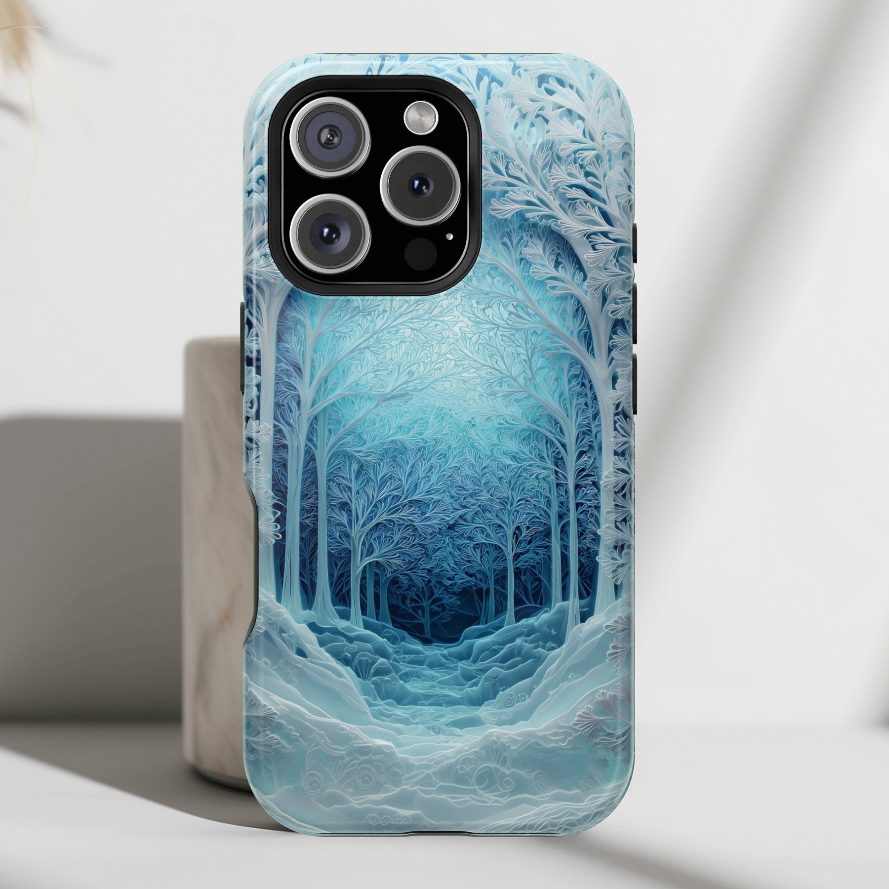Premium quality protective phone case for iPhone with Enchanted Winter Forest design.