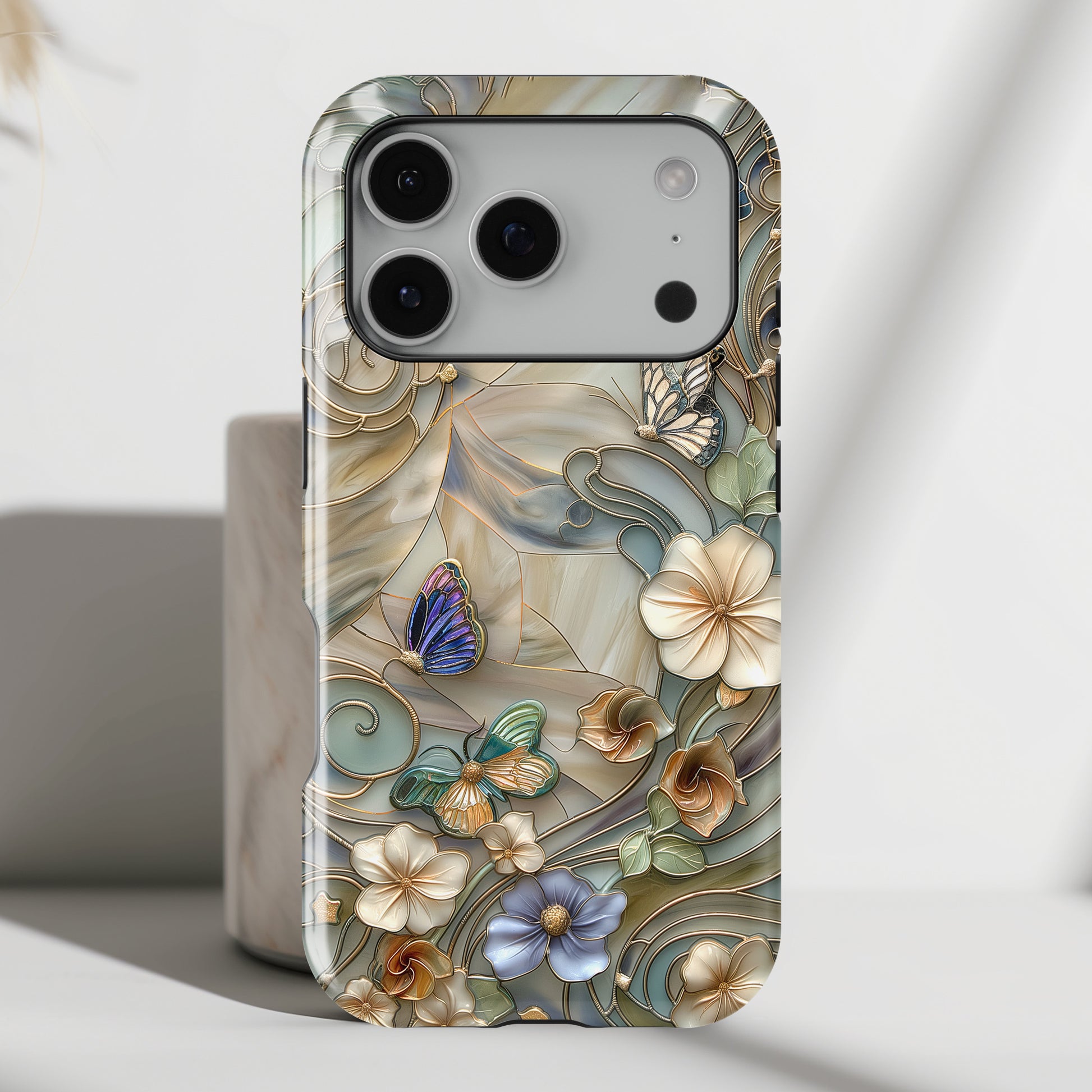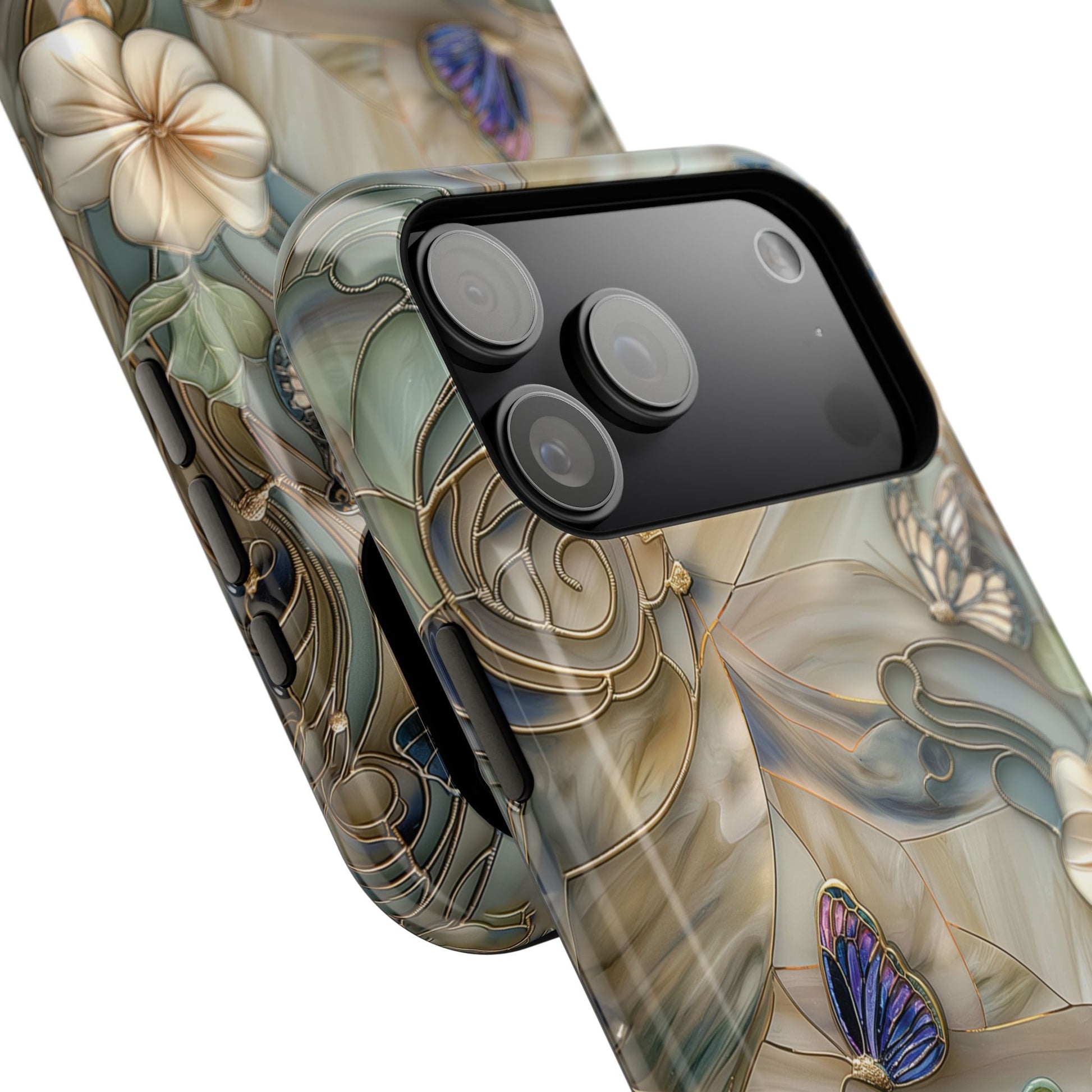 Premium quality protective phone case for iPhone with Floral Butterflies Stained Glass design.