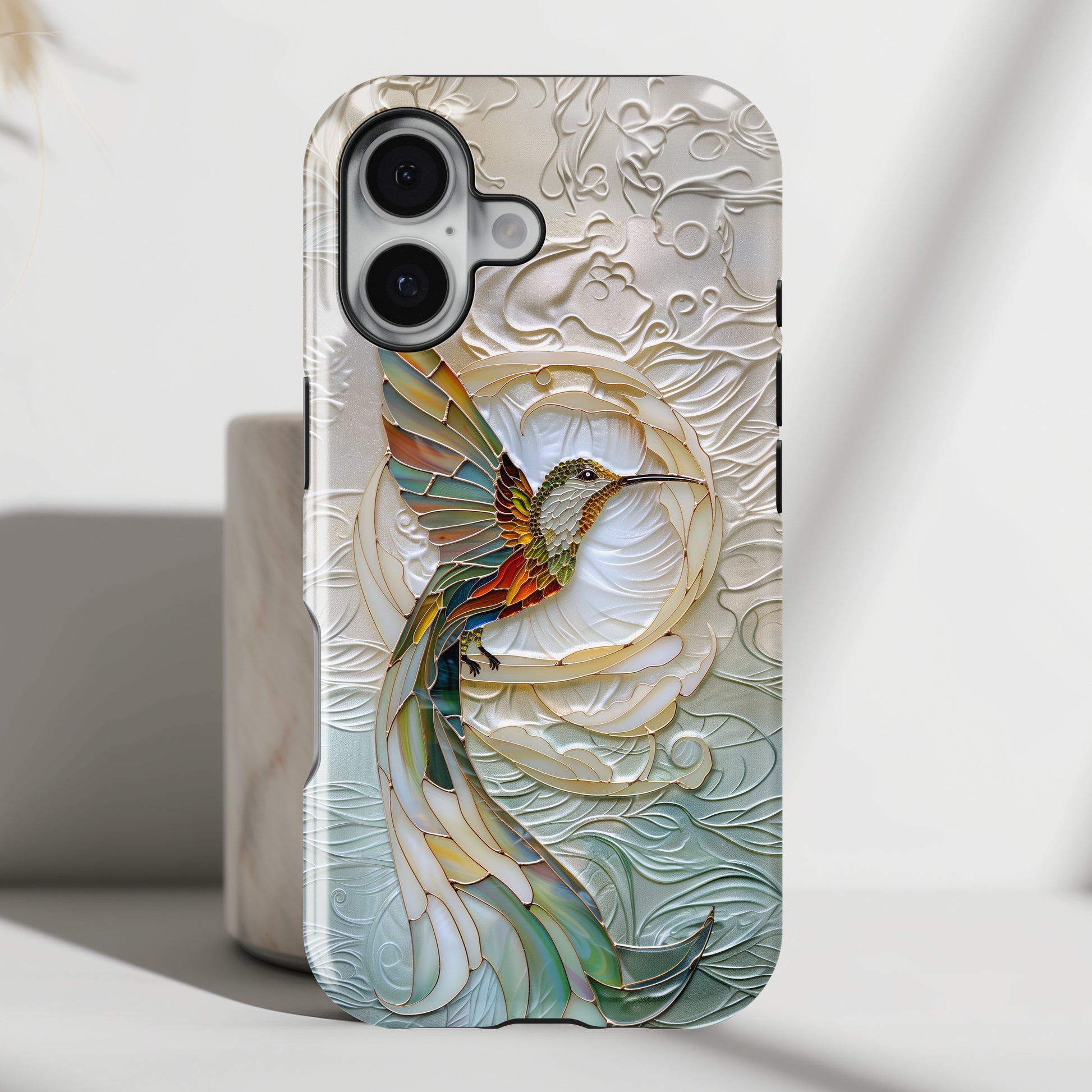 Premium quality protective phone case for iPhone in Hummingbird Stained Glass design.