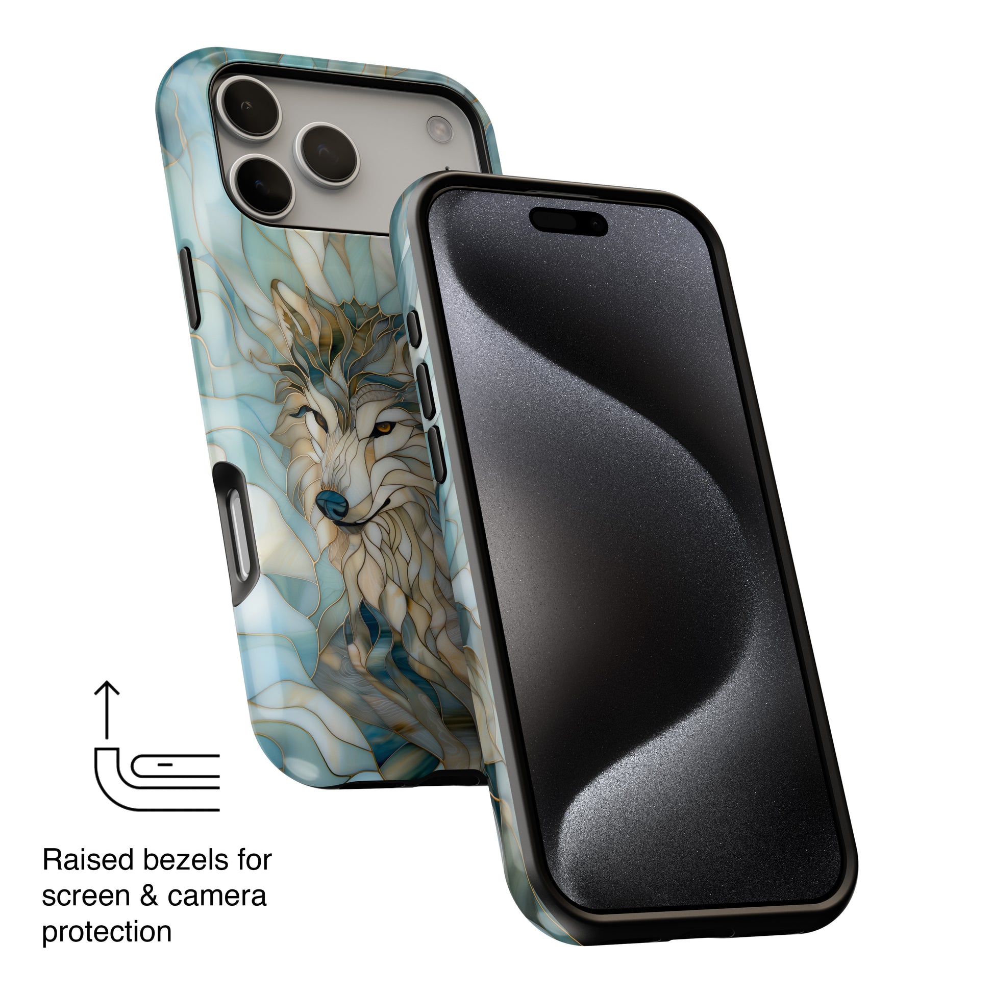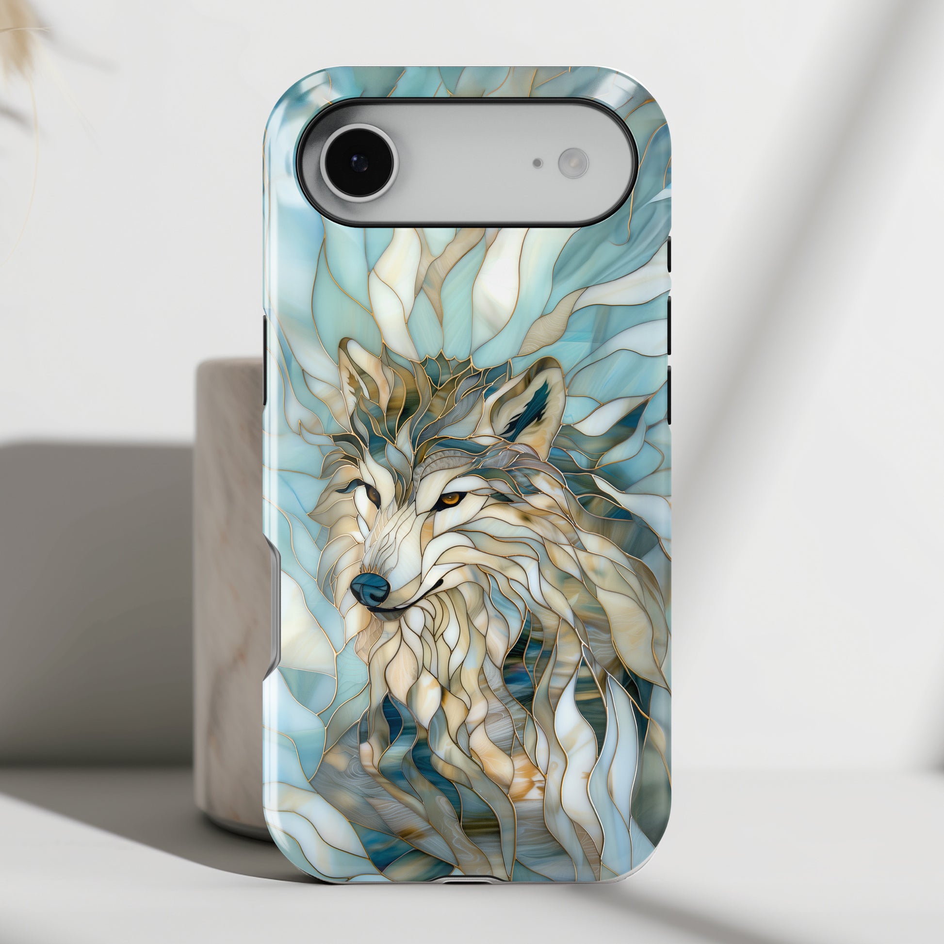 Premium quality protective phone case for iPhone with Majestic Wolf Stained Glass design.