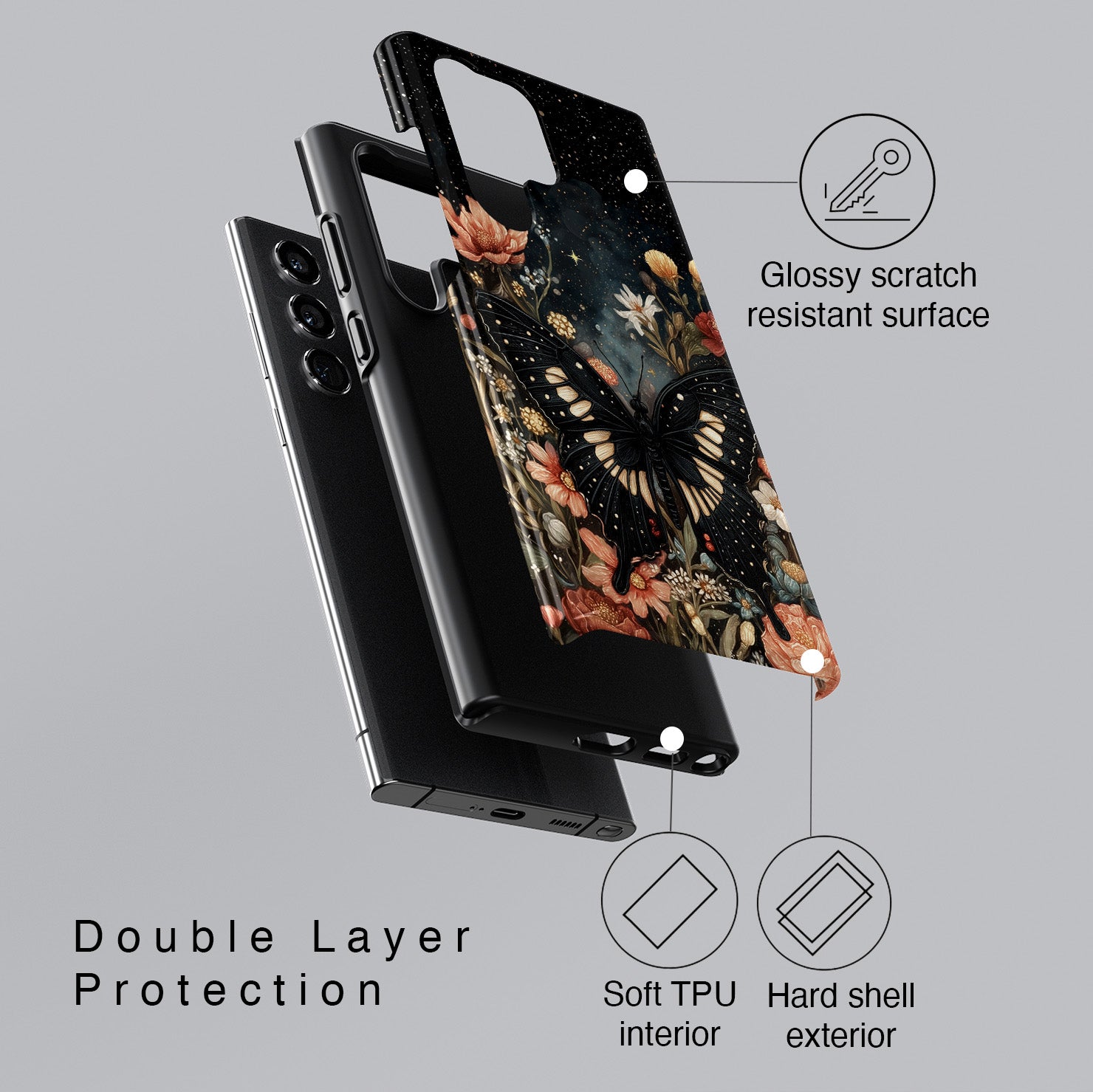 Where the earth meets the cosmos. The "Midnight Ember" case is the ultimate accessory for the dreamer who loves a touch of magic. This enchanting design features a midnight-black butterfly resting in a garden of warm, rust-colored blooms, all set against a sparkling, starry night sky.