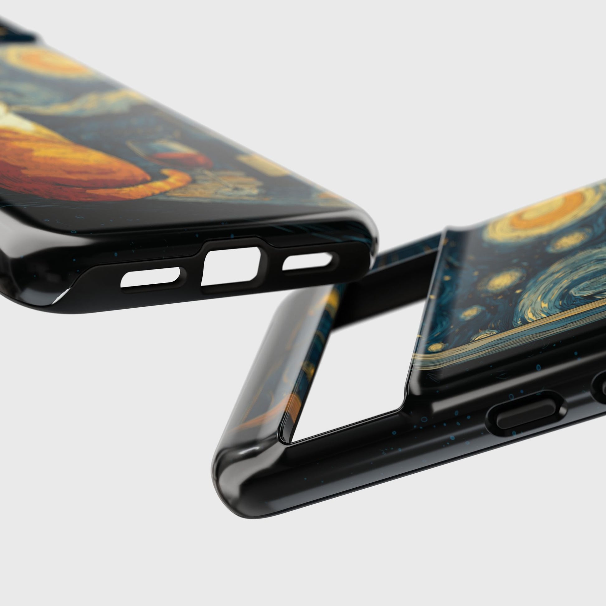 "Purrfect Evening" captures the ultimate evening mood. This brilliant case features a blissfully happy orange tabby cat sitting on a windowsill next to a freshly poured glass of red wine. Behind them, a stunning, Van Gogh-inspired swirling night sky and a glowing crescent moon set the perfect relaxing scene.