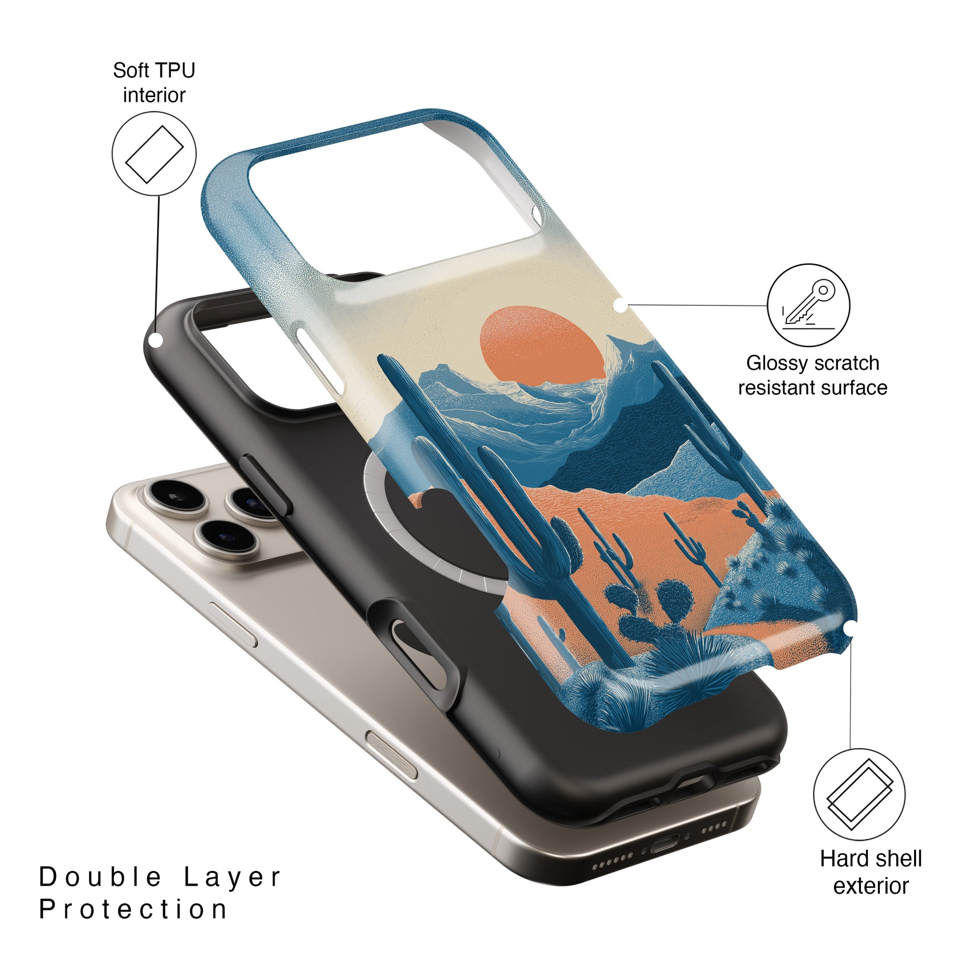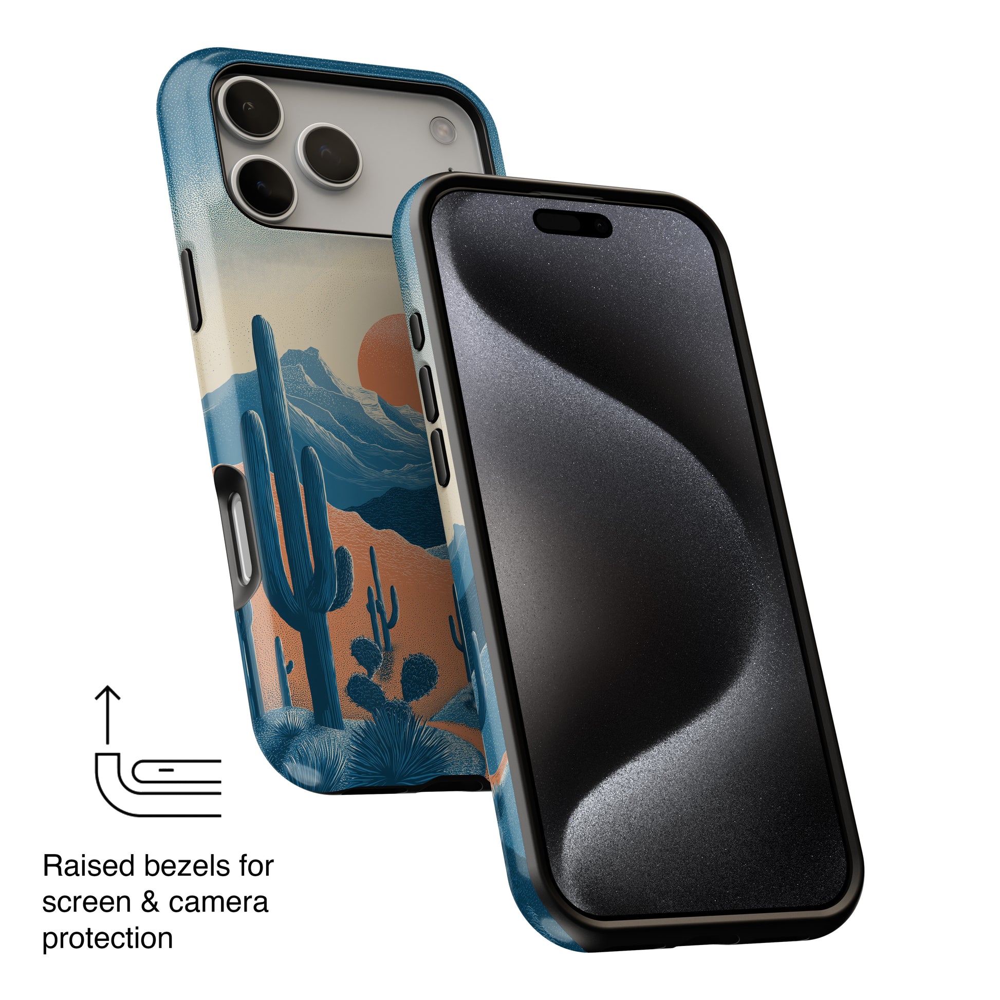 "Sedona Sunset" is the ultimate accessory for the modern explorer. Capturing the magic of golden hour in the high desert, this design features a retro-style sun rising over layers of blue mountains and saguaro cacti.
