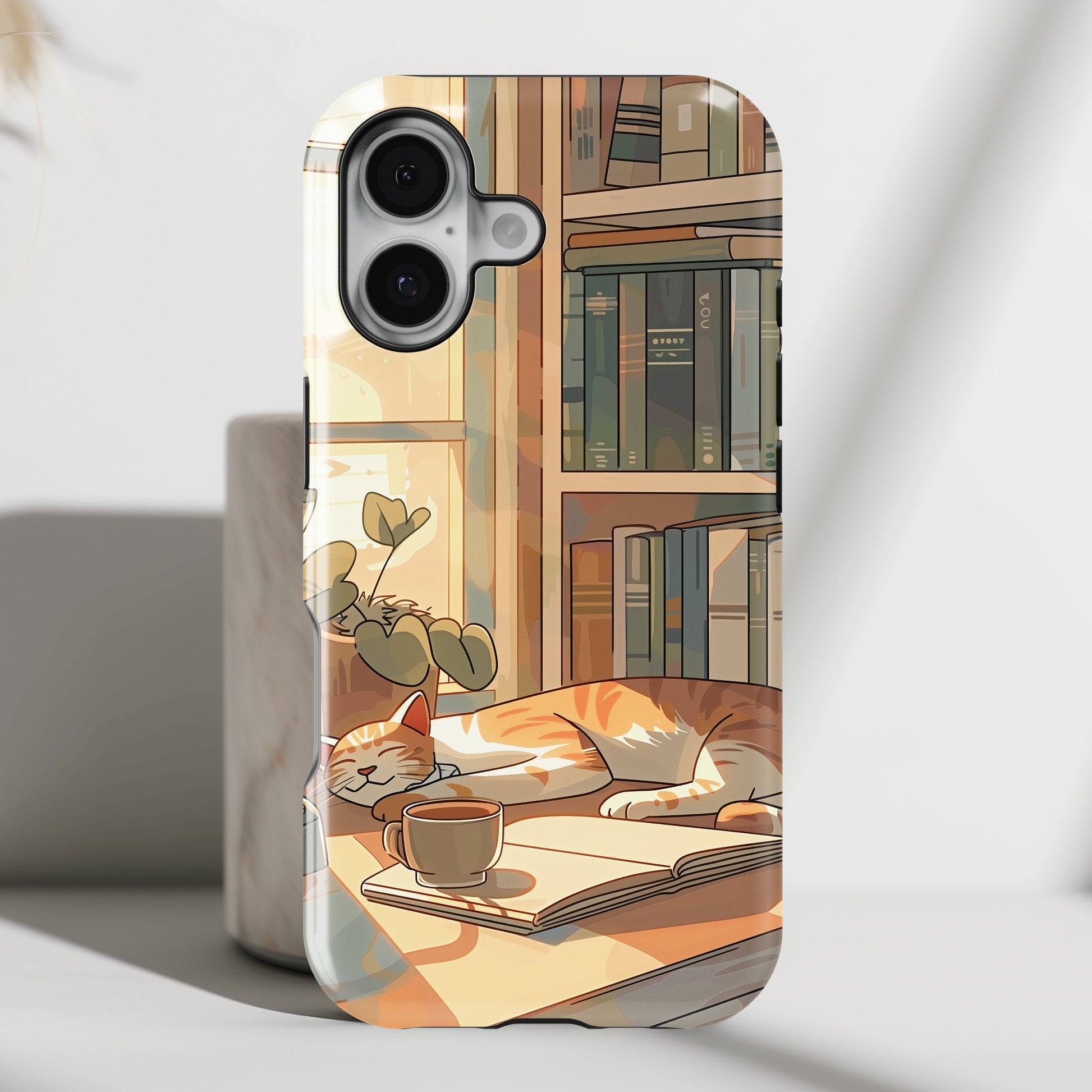 Premium quality protective phone case for iPhone with sleeping cat on a cozy study desk design.