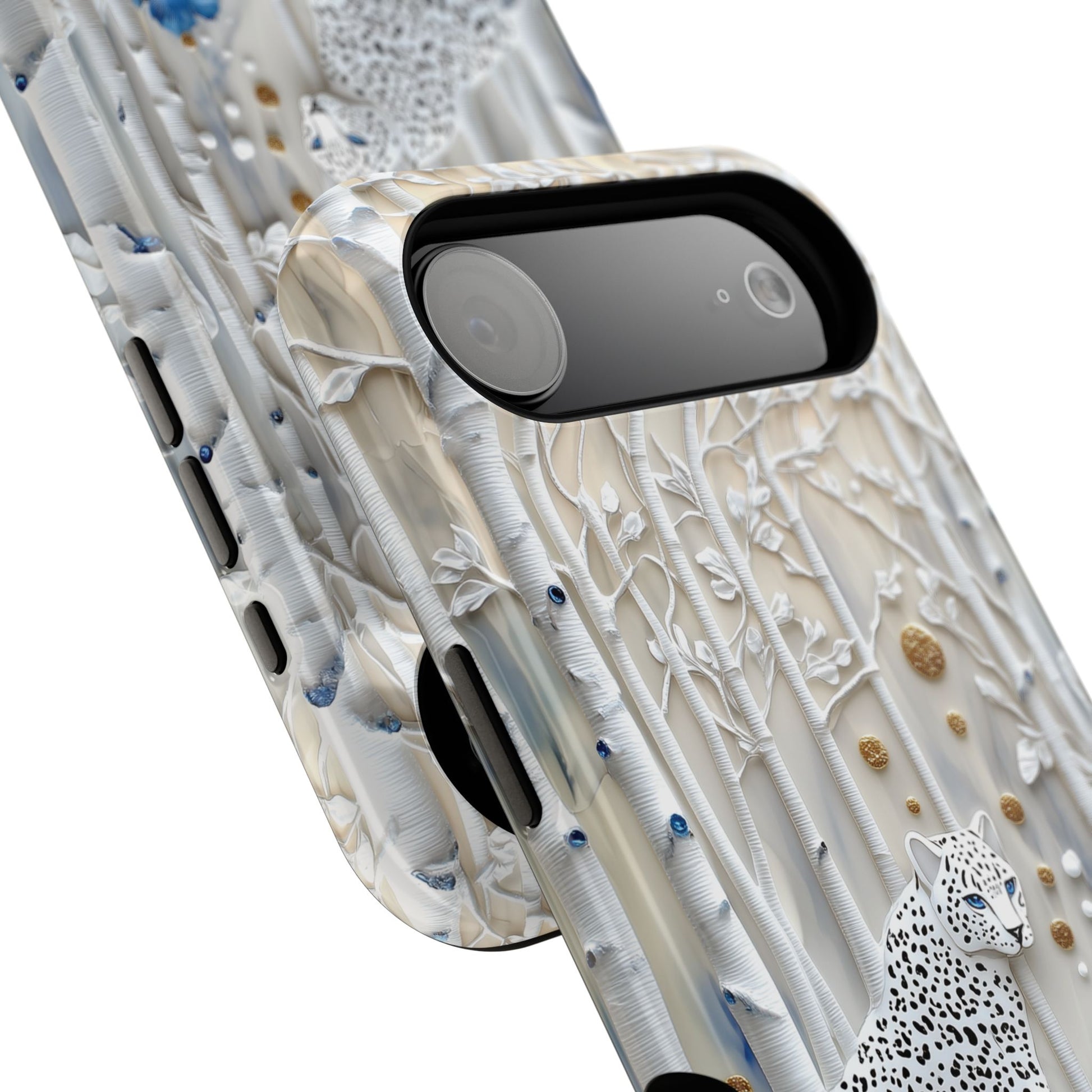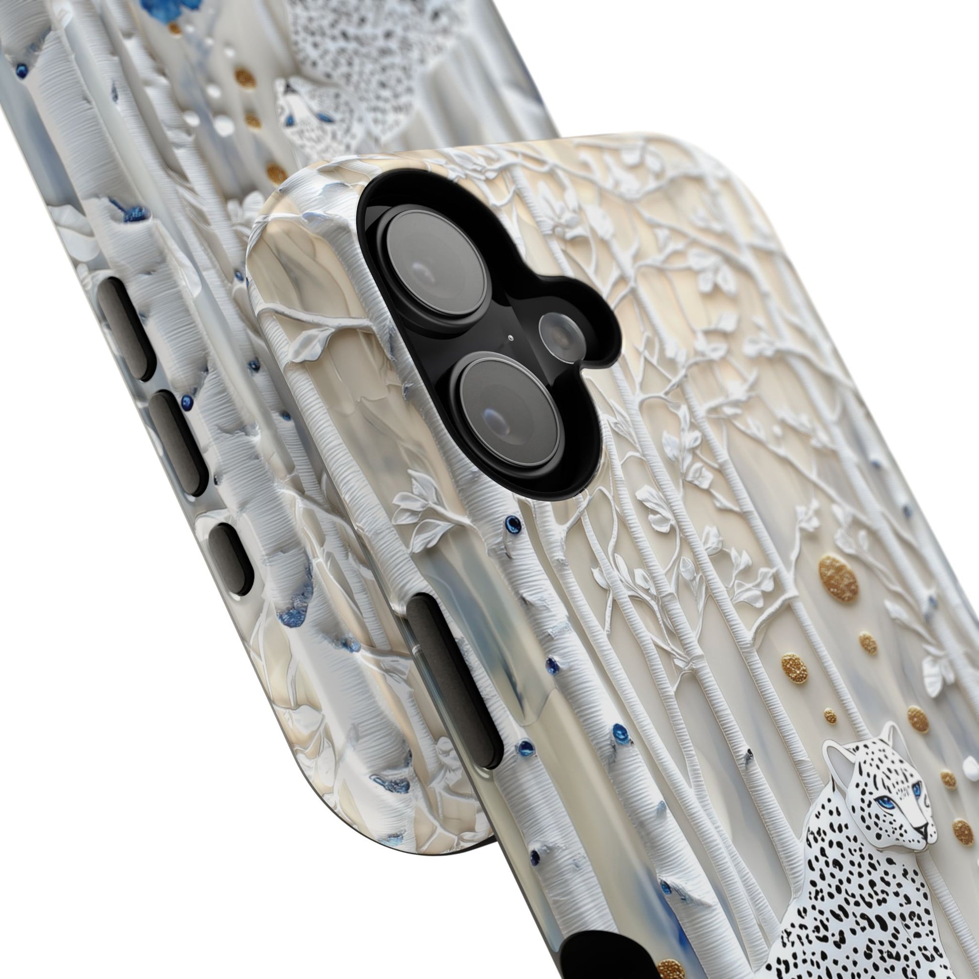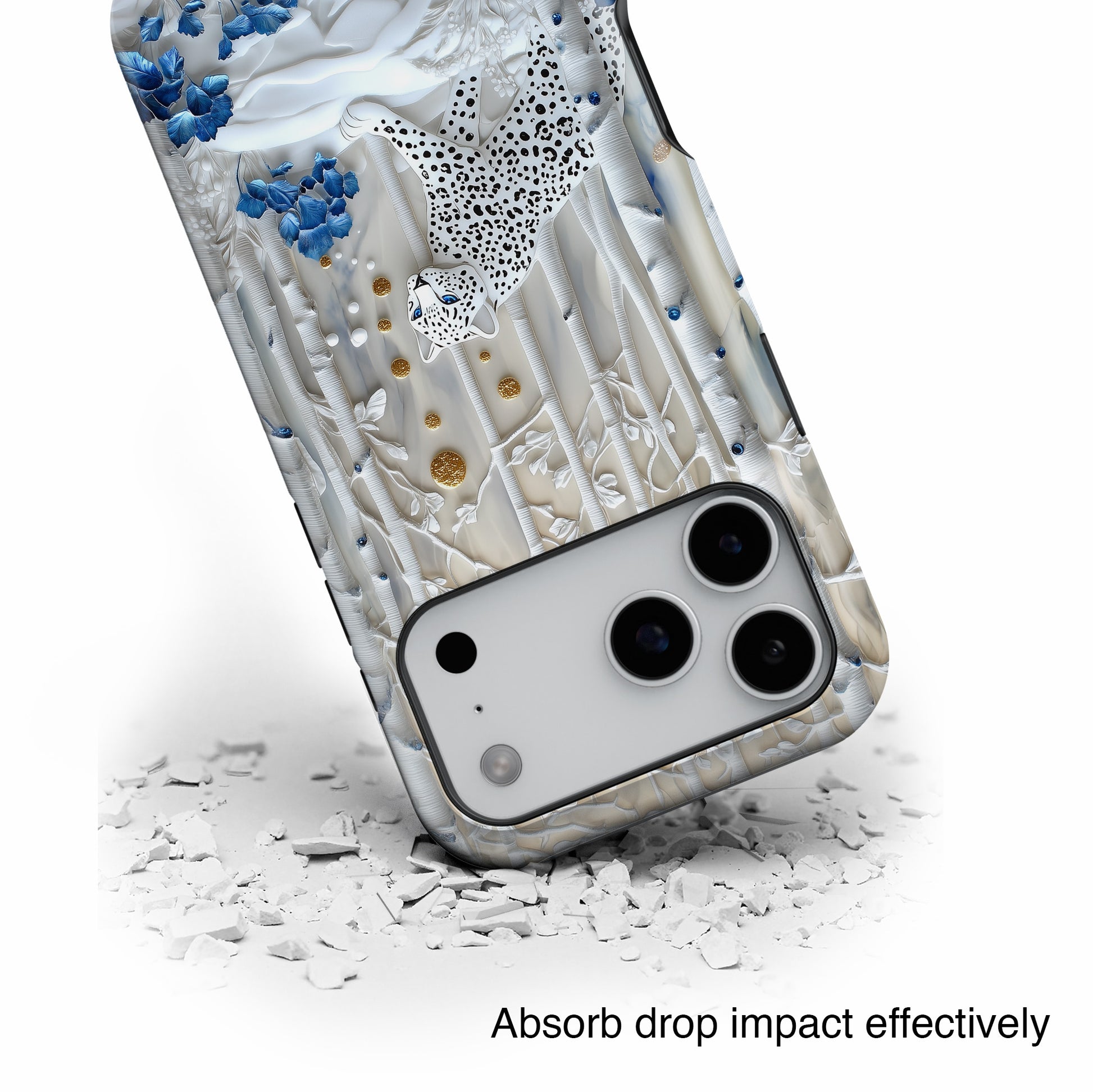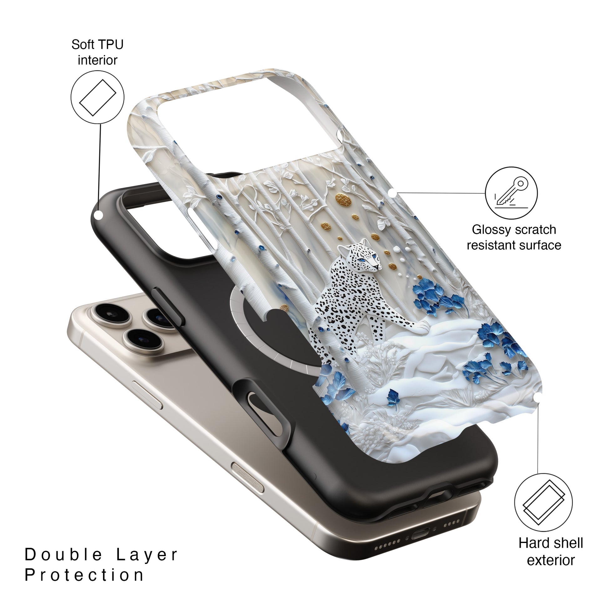 Premium quality protective phone case for iPhone with Snow Leopard in Winter Forest design.