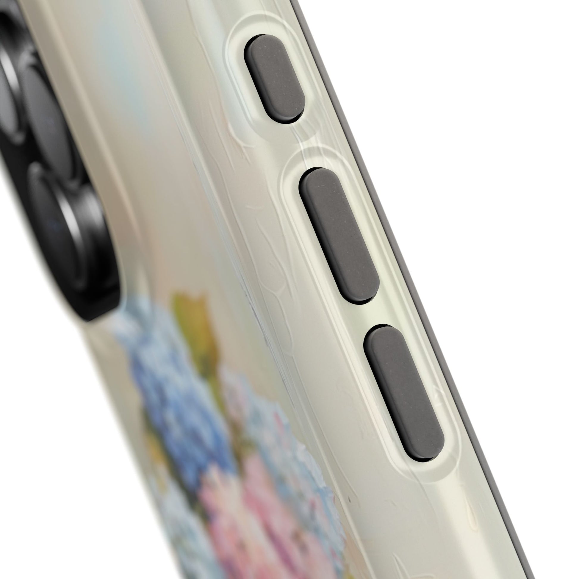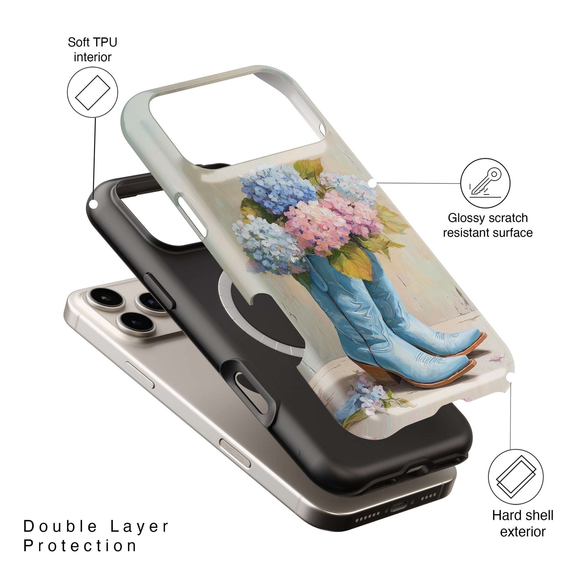 This beautiful design features a pair of classic, worn-in sky blue cowboy boots overflowing with a lush, pastel bouquet of pink, purple, and blue hydrangeas. Rendered in a stunning, thick impasto oil painting style, the artwork features visible, highly textured brushstrokes and palette-knife details that give it an authentic gallery feel. Complete with delicate fallen florets resting on the rustic floorboards, this case transforms your phone into a gorgeous, romantic still-life painting.