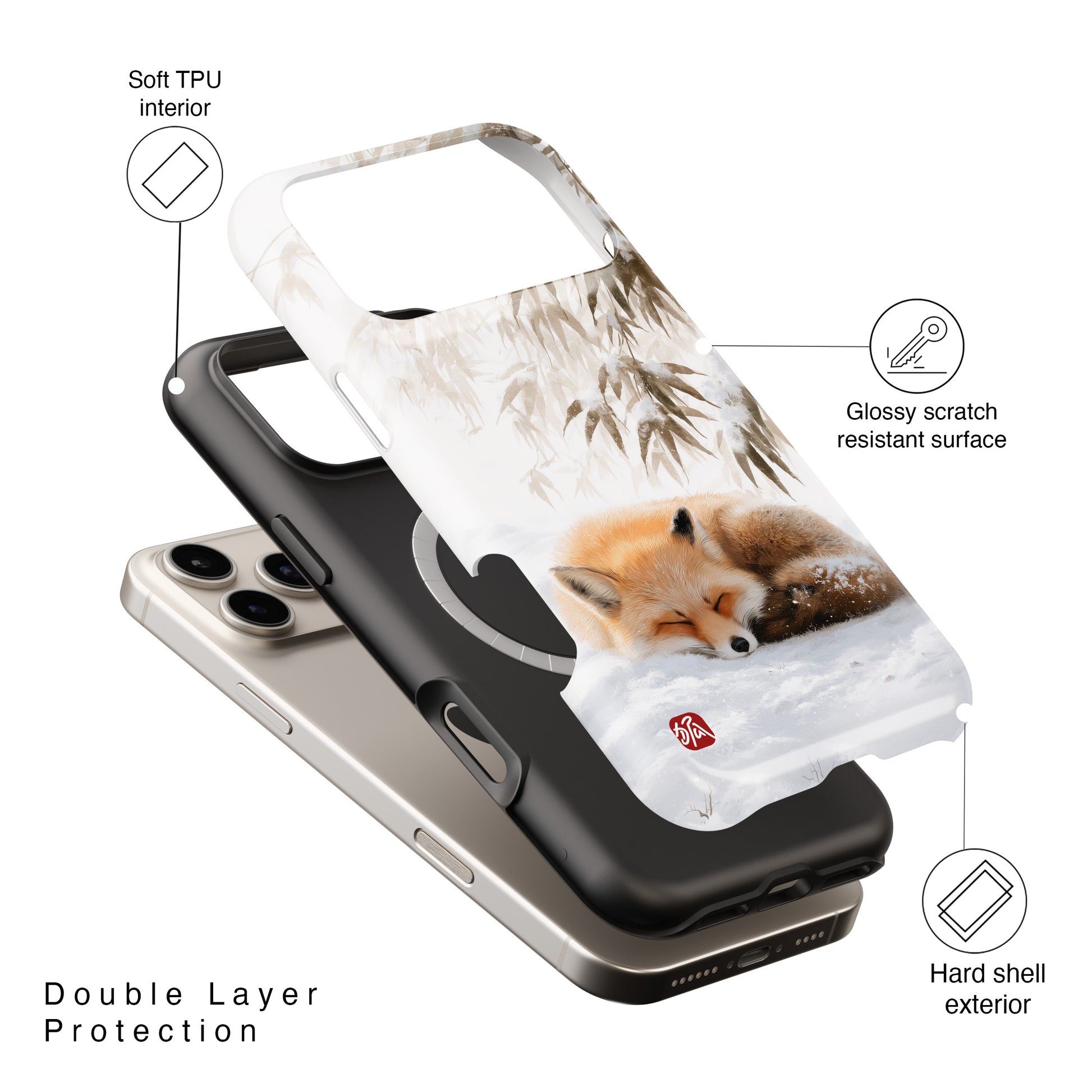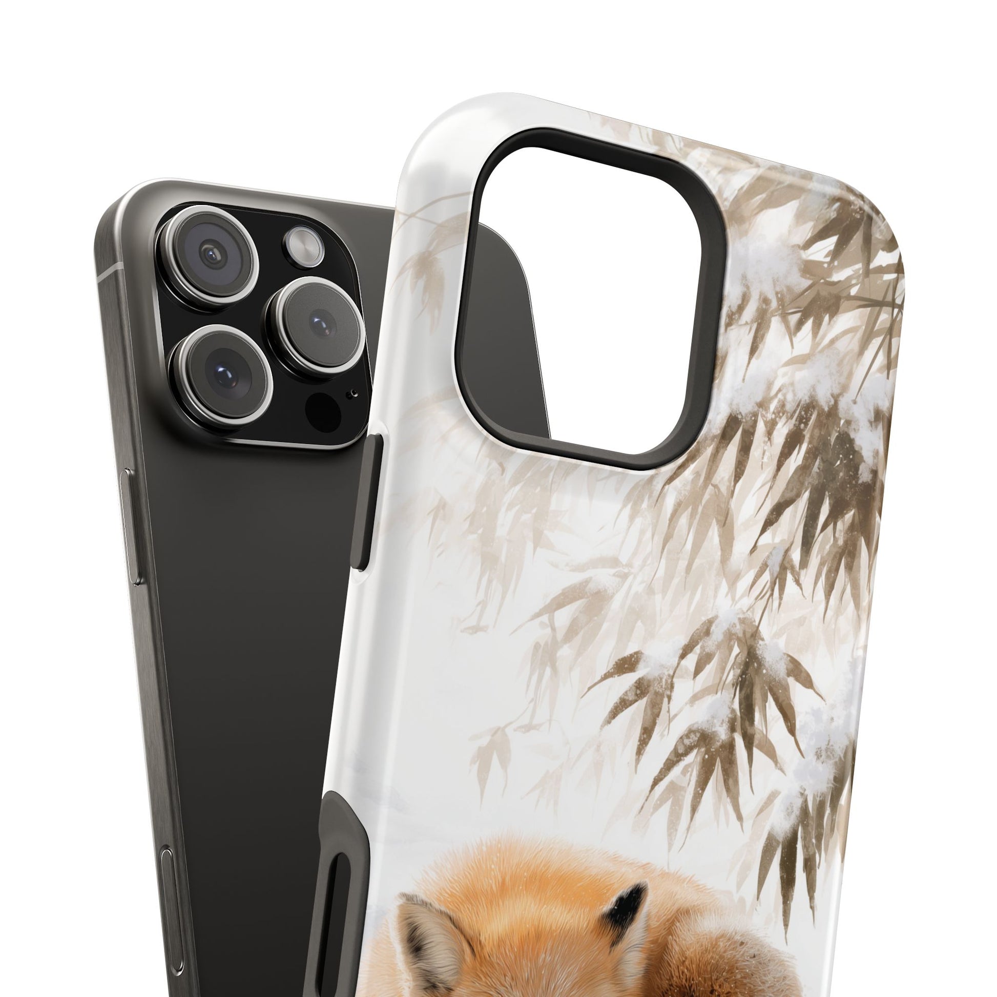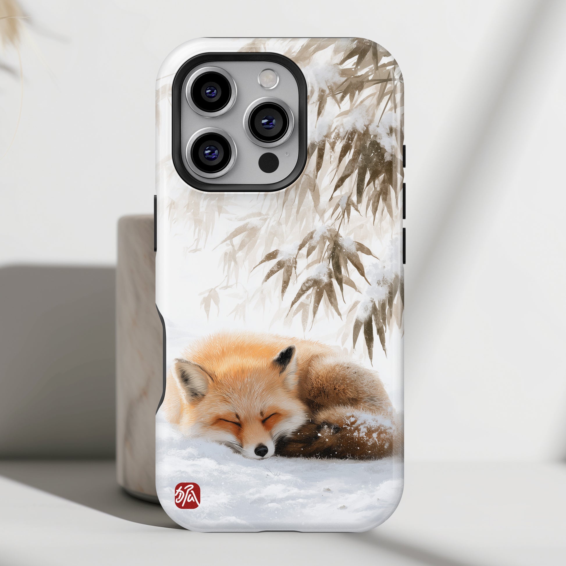 Inspired by the serene beauty of traditional East Asian ink-wash painting, the "Snowfall Slumber" case is a masterpiece of mindfulness. It features a sweet red fox sleeping peacefully in the snow, sheltered beneath a delicate, snow-dusted bamboo canopy.
