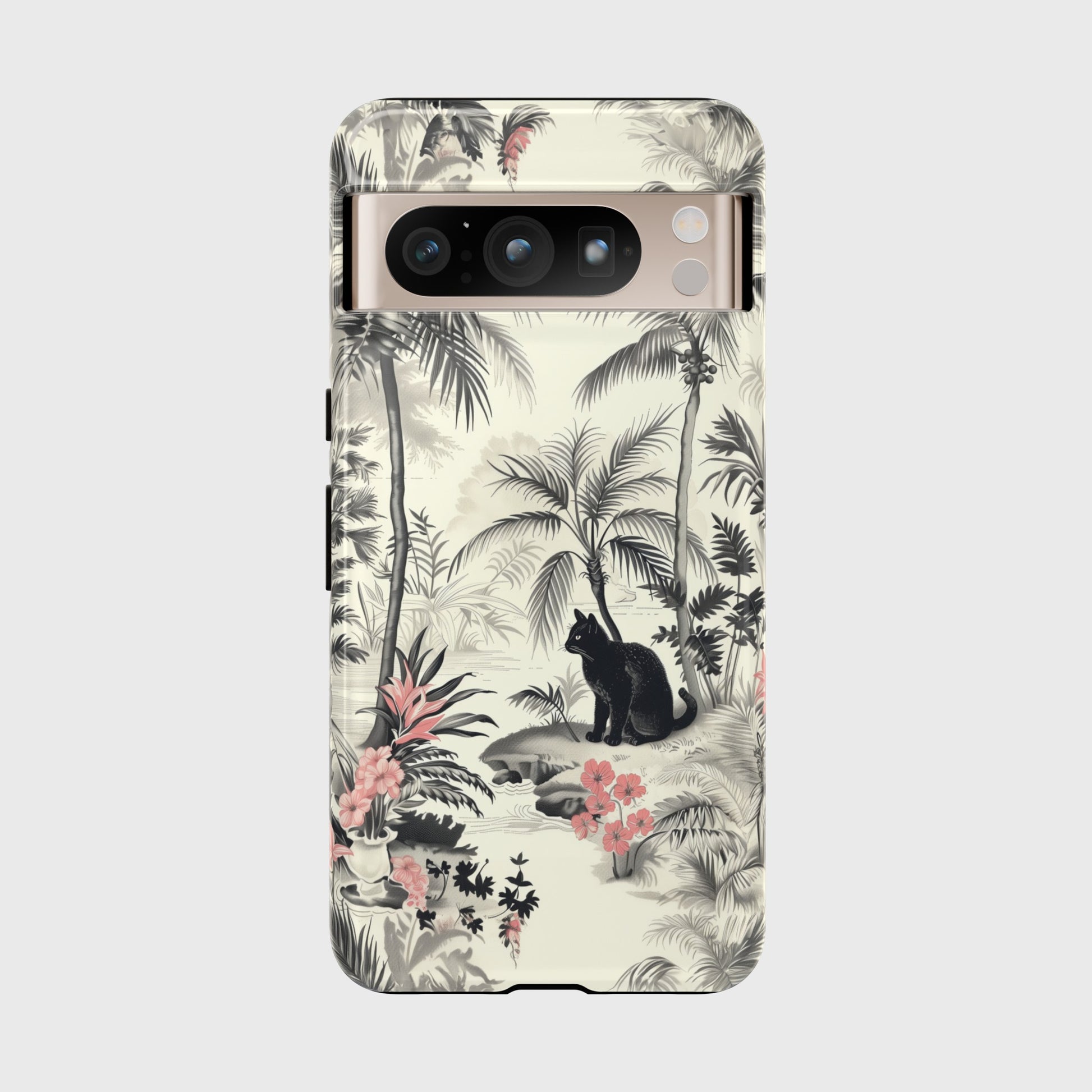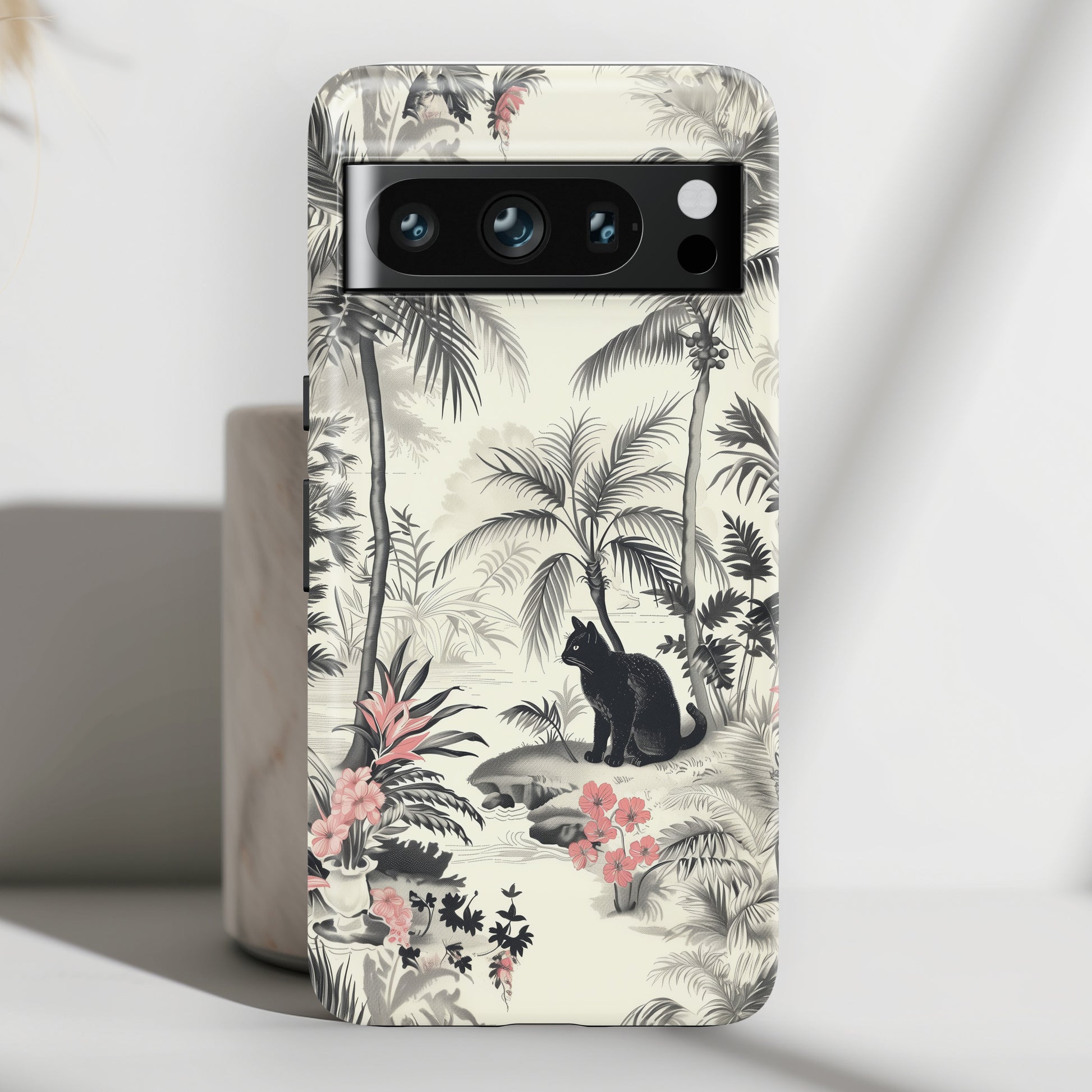 Premium quality protective phone case for Google Pixel series with Toile de Jouy Tropical Cat Design.